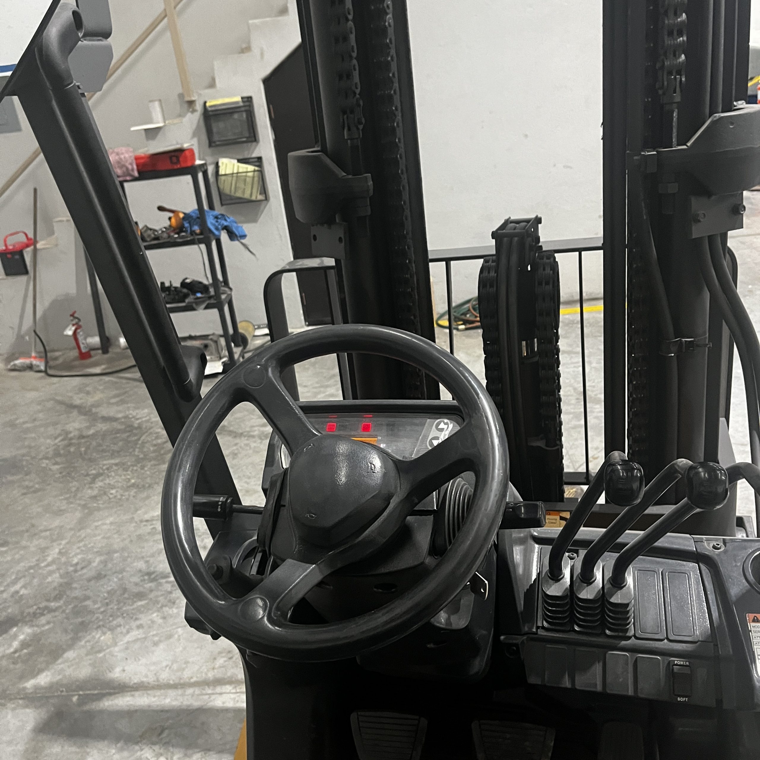 Incluye desplazador lateral, que facilita el posicionamiento exacto de la carga, y un sistema integral de seguridad para proteger al operador. Su diseño robusto, rendimiento confiable y mantenimiento sencillo lo convierten en una excelente opción para almacenes, plantas y operaciones industriales que buscan productividad y durabilidad.